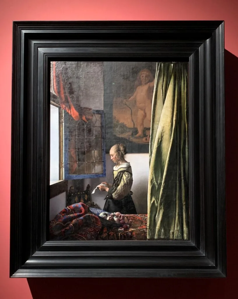 그림(왼), 밖에서 불어 바람이 커튼의 윗부분을 휘익하고 감았네요. 열린 창문에 반투명으로 반사된 소녀의 얼굴이 보이고요. 이 정도면 페르메르의 관찰력에 엄지 척해 줘야 할 것 같습니다. 창을 통해 들어온 아늑한 빛이 소녀의 이마, 머리, 둥근 어깨를 거쳐 편지를 읽고 있는 손에 잠시 머무르는 것 같습니다. 황록색 커튼은 지극히 사적인 공간 안으로 들어온 느낌이 들고요. 벽에 큐피드 그림이 있는 것으로 보아 연애편지를 읽고 있다는 사실을 암시합니다.