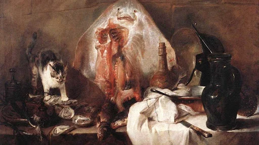 각각의 구성 요소들이 주는 실제와 흡사한 현실감은 이후 화가들에게 하나의 전형적인 '정물'의 규칙처럼 중요한 의미를 부여합니다. 샤르댕이 그림 속 가오리를 그리는 사실적인 방식에 충격을 받았다는 얘기죠. 흩어진 굴 껍데기를 가볍게 밟으면서 등을 아치형으로 구부리고 털을 곤두세운 작은 고양이 한 마리가 왼쪽에 배치되어 있습니다. 생명 없는 물고기들의 수척함도 뚜렷이 부각되고요. 오른쪽에는 주방 기구들이 모여 있습니다.