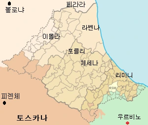 그림1.로마냐와 우르비노 지도/wikipedia그림2. 15세기,이탈리아 행정지되및 도로지도/행복공작소