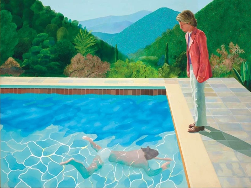 <예술가의 초상 Portrait of an Artist>은 1972년 제작된 호크니의 '수영장 시리즈'중 하나입니다. 물속에서 자유롭게 평영을 하는 남자가 보입니다. 빨간 재킷 차림으로 수영장 밖에 서서 물끄러미 수영하는 남자를 지켜보는 시선도 있고요. 그림 속에 서 있는 남성은 호크니의 11살 연하 애인이었던 피터 슐레진저로 추정되기도 합니다. 호크니 자신이 또 다른 자신을 보고 있는 것으로 해석되기도 하고요. 정적이면서도 많은 사연이 담긴듯한 분위기의 그림은 호크니 작품의 정수로 현존 작가 최고액이라는 기록을 낳게 됩니다.