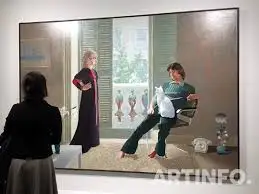 이 작품의 모델은 데이비드 호크니의 절친이자 1960-70년대 런던 패션 산업을 선도한 디자이너 부부입니다. 1960년대 후반과 1970년대에 호크니는 자신의 주변 사람들과 세계에 감성적으로 반응하며 이미지를 제작했습니다. 특히 이 시기에 그려진 2인 초상화시리즈는 영국 테이트미술관에서 가장 인기가 높습니다. 이 작품들은 오랫동안 주변 인물들을 모델로 면밀히 관찰하고 다수의 습작 드로잉을 거듭한 끝에 탄생한 작품입니다. 특히 이 작품의 등장인물들은 거의 실물크기로 제작되어 마치 관객이 서 있는 실제 공간에 대상이 존재하는 것 같은 느낌을 불러일으킵니다.
