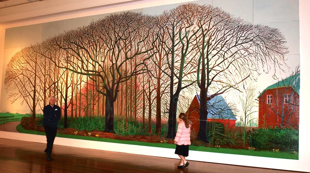 이 작품은 커다란 규모로 인해 앞에 다가서는 순간 마치 실제 나무숲에 서 있는 듯한 느낌을 줍니다. 이는 호크니가 말하는 "자연의 무한한 다양성" 한 복판에 자리하게 되는 순간인 거죠. 처음 작품을 접할 때는 요소들의 다양성과 복잡한 관계를 한눈에 포착하기 어렵습니다. 이로 인한 약간의 불안감은 곧 작품 곳곳을 탐색하게 되는 즐거움과 환희로 바뀌게 되지요. 또한 호크니는 이 풍경화를 그릴 때 배경의 숲을 염두에 두고 그렸다고 합니다. 큰 나무 뒤에 있는 공간을 살리고 싶었던 거죠. 그래서 겨울나무를 그리게 되었고요. 만약 나무의 잎이 무성한 여름철이 배경이 되었다면 뒷 배경의 공간이 보이기 힘들었을 테니까요. 그와 우리를 구별 짓는 호크니만의 독특한 시선을 느끼게 됩니다.