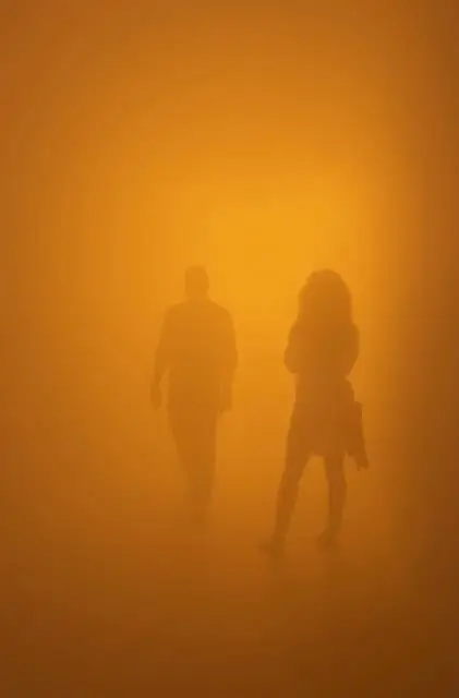 사진1. 날씨가 좋지 않은 영국에 거대한 인공 태양이 떴습니다. 그것도 미술관 내부에 말입니다. 엘리아슨의 이름을 세계인들에게 각인시키는 계기가 된 작품 <Weather Project, 2003>입니다. 단색광을 활용해 앞의 관객들이 흑백으로 보이는 걸 볼 수 있습니다. 영국 테이트모던 미술관의 가장 큰 공간인 터바인 홀에 만들어진 작품입니다. 200여 개의 단색 파장 전구로 만든 태양은 그 넓은 공간을 온통 빛으로 물들입니다.