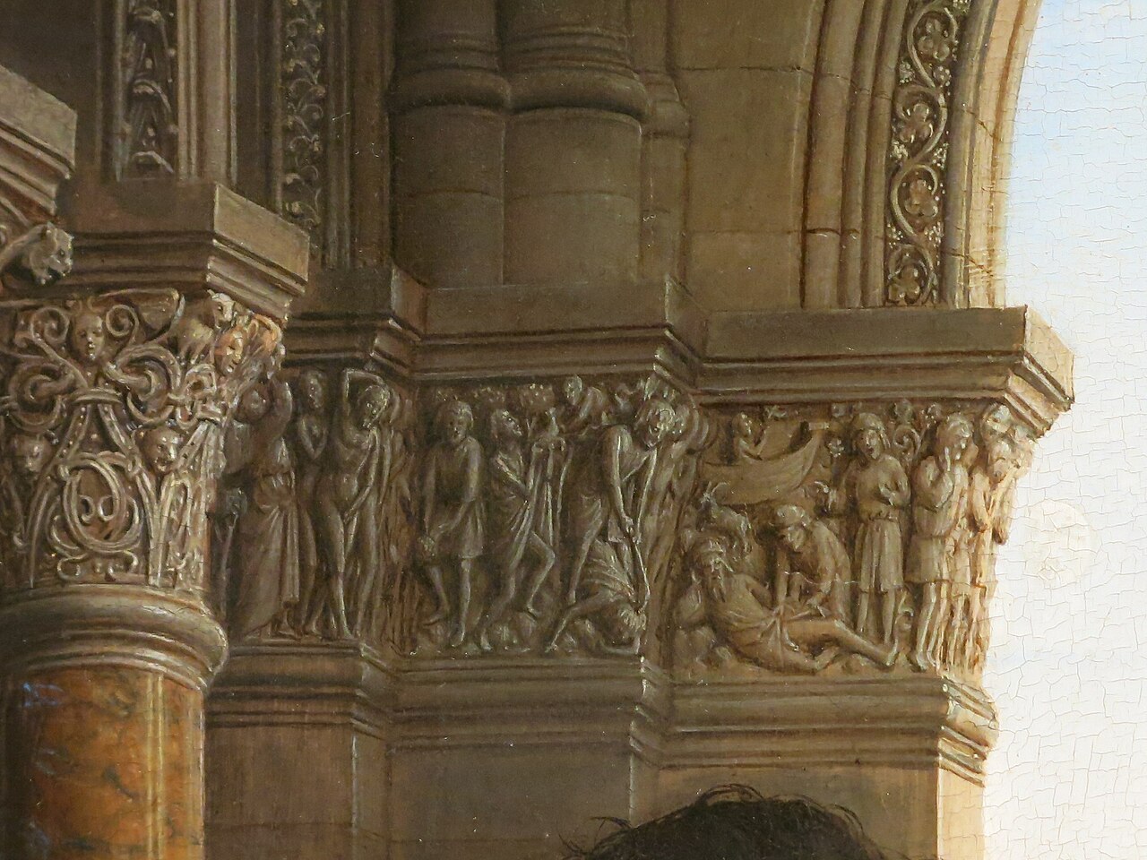 멀리 발코니의 두 남자 중 붉은 터번을 머리에 쓴 남자는 얀 반 에이크(Jan van Eyck, 1390?-1441))로 추정됩니다. 강을 사이에 두고 수상의 뒤쪽으로는 그가 부르고뉴에 소유한 포도원을 연상시키는 언덕, 작은 성당, 광장 등이 보입니다. 좁은 다리 위로 수십 명의 사람들이 그려져 있고요. 다양한 색깔의 옷을 입은 사람들이 좁은 골목에서 걷고 있습니다. 풍경에 대한 모든 세부 사항들은 너무 사실적으로 그려져 마치 '인간 사진기 '같다는 생각을 해보게 됩니다.