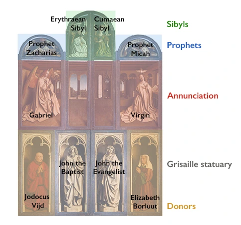 닫혔을 때는 상-중-하 3단으로 구성되어 있습니다. 하단에는 봉헌자 요스 베이트-세레자 요한-사도 요한- 이사벨 보루트, 가운데는 수태고지로 가브리엘 천사와 성모 마리아, 상단은 선지자 즈카르야-이교도 무녀 에리트 레이와 쿠마이 -선지자 미가 등 한 폭, 한 폭이 마치 개인 초상화처럼 그려졌습니다.