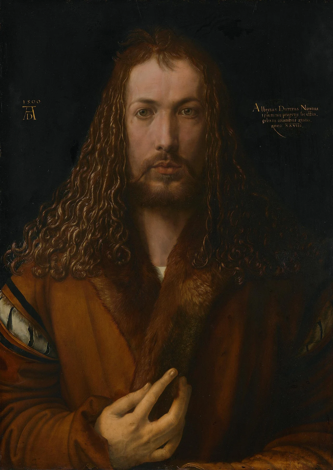 뒤러 자화상 왼쪽과 오른쪽 배경에 쓰여 있는 모노그램(AD)과 명문의 배치는 마치 공간에 떠 있는 것처럼 보입니다. 이는 초상화가 매우 상징적인 의미가 있음을 강조하고 있습니다. 검은 배경에 맞추어 갈색 톤의 전체적으로 어두침침한 분위기는 작가의 이전 두 자화상에서 보이는 붓터치와 사뭇 다릅니다. 무엇보다 정면을 응시하는 포즈는 그리스도만 가능했던 포즈입니다. 감히 한 개인이 정면포즈의 자화상을 그리는 것이 위험할 수도 있는 일이지요. 자의식의 성장으로 그만큼 화가로서의 자존감이 높았다고 할 수 있습니다.