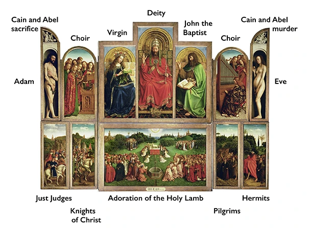 겐트 제단화(Ghent Altarpiece)는 1432년에 완성된 얀 반 에이크(Jan van Eyck)의 대표작으로, 초기 네덜란드 르네상스 미술의 걸작입니다. 대형 다폭 제단화로, 여러 개의 패널로 구성되어 있습니다. 열고 닫을 수 있지요. 중앙 패널에는 '신비의 어린양 경배'가 묘사되어 있습니다. 전체적으로 구원의 메시지를 전달합니다.