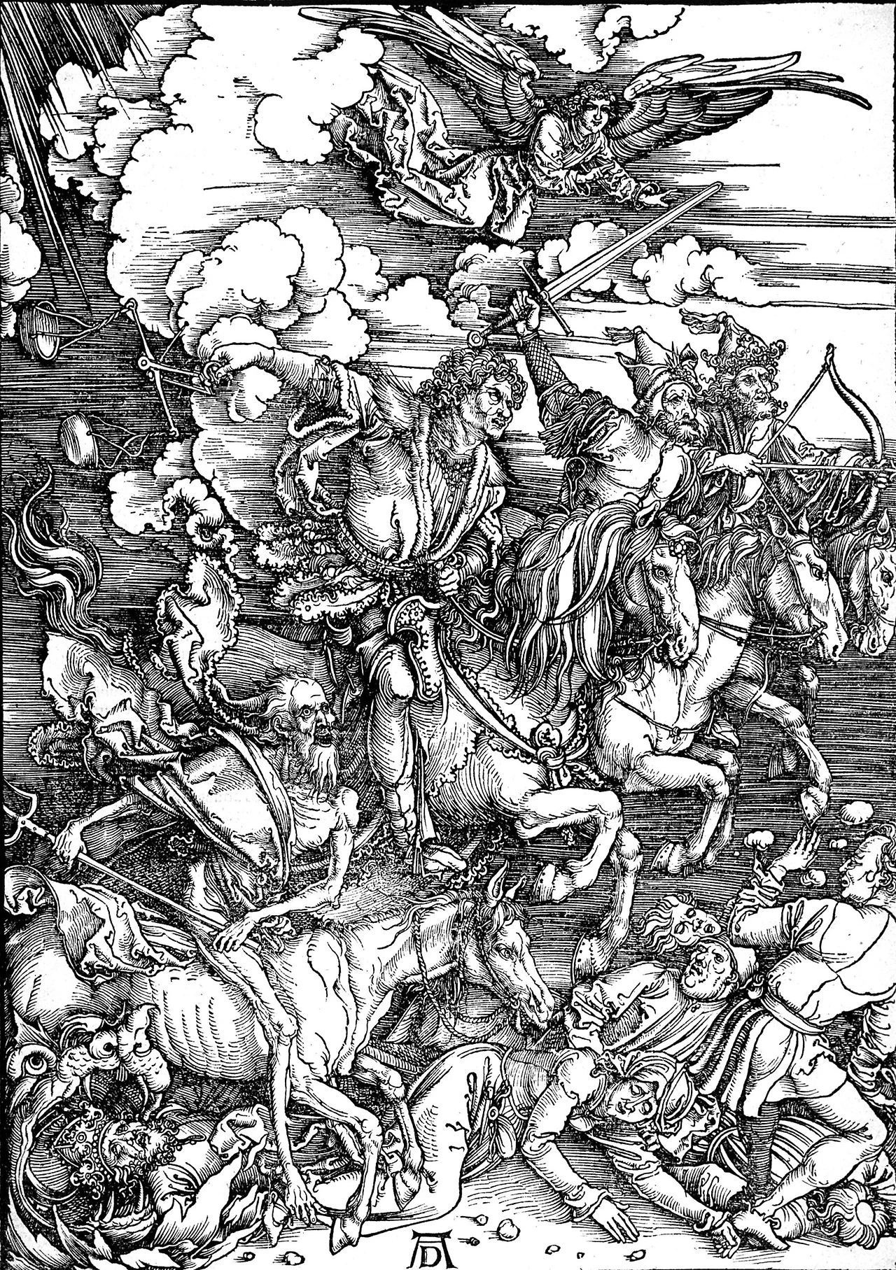 알브레히트 뒤러의 <The Four Horsemen of the Apocalypse>(1498)는 목판화 작품으로 요한계시록의 내용을 바탕으로 한 유명한 연작 중 하나입니다. 야콥 헬러(Jakob Heller)의 의뢰로 그의 개인 예배당을 위해 만들어진 작품입니다.