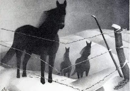이 석판화는 겨울철 미국 풍경을 묘사한 것으로, 부드러운 흰 눈과 대조를 이루는 말들의 어두운 형상이 특징입니다. 철조망 울타리는 미국 농부들이 험난한 땅을 길들이고 경작하려는 노력을 상징합니다. 이 작품은 대공황과 더스트 볼의 어려움에서 벗어난 이상적인 농업 낙원을 묘사하려는 Wood의 스타일화된 미학과 시적인 비전을 보여줍니다.