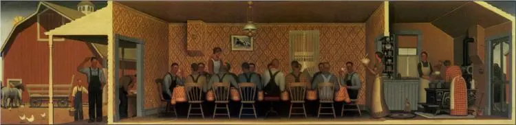 작품의 구성은 초기 르네상스 그림을 연상시킵니다. 농부들을 성경의 제자들과 같은 존엄성을 가진 인물로 표현합니다. 이는 대공황시기의 그림에서만큼은 풍요로웠던 예전 시절을 기억하고 싶었나 봅니다. 이런 행사는 단순히 일에 대한 것뿐만 아니라 식사, 이야기, 뉴스를 공유하는 중요한 행사로서의 기능도 했겠지요. 아무튼 < Dinner for Threshers>는 미술사적으로 중서부 농업 사회의 문화를 기념하고, 이를 예술적으로 승화시키려는 우드의 노력을 보여줍니다.