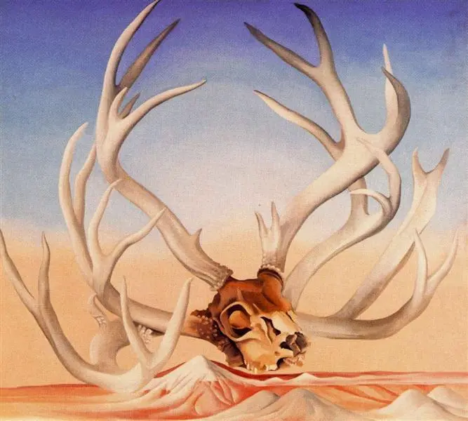 그림은 거대한 사슴뿔이 사막을 덮고 있는 모습을 보여줍니다. 우리 눈에 현실적이지 않은 장면을 그린 거죠. 사슴뿔이 실제와 다르게 거대한 크기로 표현되어 있습니다. 이는 그녀의 추성적이고 상징적 표현 방식을 보여줍니다. 이 구성은 공간적 모호성을 만들어내며, 가까운 대상과 멀리 있는 대상이 하나의 장면에서 결합된 모습을 보여줍니다. 오키프가 뉴멕시코 사막에서 발견한 광활한 풍경과 사물의 거리감을 그녀만의 방식으로 풀어낸 거지요. 일상을 살아가는 우리 눈에 말도 안 되는 광경이 벌어집니다.