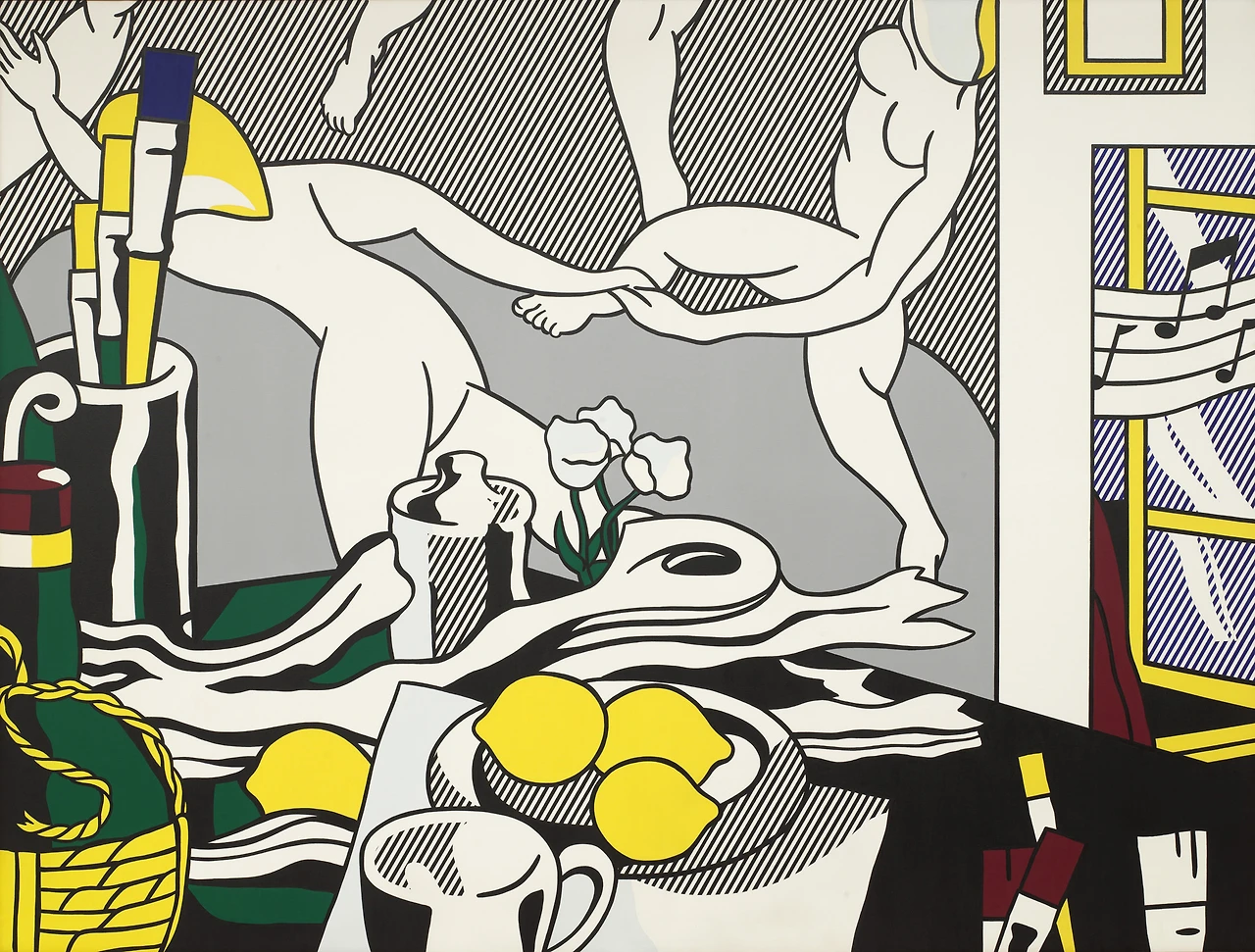 리히텐슈타인의 이 작품은 자신이 작업하던 스튜디오의 모습을 담은 스케치를 기초로 하고 있습니다(그림 왼쪽). 그의 독특한 시각적 언어와 만화적인 요소가 혼합된 형태로 구성되어 있고요. 예술가의 작업 공간을 주제로 삼고 있습니다. 그 안에서 일어나는 활동이나 감정, 창작 과정을 표현하고 있습니다 .
