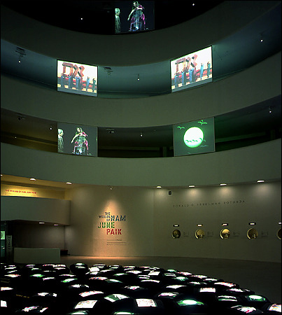 구겐하임 측에서는 회고전인 만큼, 신작인 레이저 작업뿐만 아니라 백남준의 과거 작품을 다 선보이길 원했습니다. 백남준은 뇌졸중으로 구안와사가 와 왼쪽 반신이 마비되고, 말하기도 힘들었지만 과거 작품들을 손보고 재작 업하는 것도 게을리하지 않았습니다. 전시장 메인 홀에는 프랑스에서 극찬받았던 작품 < TV정원>을 깔고, 미술관 곳곳에는 < TV 부처>, <굿모닝 미스터 오웰>의 영상 등 그의 대표작을 설치했죠.