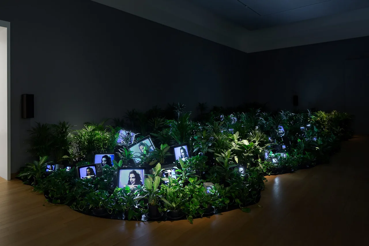 백남준의 <TV 정원>(1974)입니다. 이 작품에서는 다양한 식물이 우거진 숲을 이루고 , 그 사이사이에 30대의 티브이를 배치한 것이 특징입니다. 자연과 첨단 기술이 공존하는 것이죠. 정원 속 TV는 하늘을 향해 놓여있고, TV에서 송출되는 화면엔 <global Groove>가 나오고 있습니다. 형형색색의 화려한 영상은 마치 TV꽃이 핀듯한 모습을 연출했고요. 미술관이라는 인공적인 환경에 조성된 자연, 그리고 이 자연과 상반되는 것으로 여겨지는 첨단 기술의 상징 TV가 놓인 모습, 이 작품 역시 <TV부처>처럼 상반된 두 개의 이미지와 함께 제시되며, 관객들에게 직관적인 생경함을 안겨줍니다.