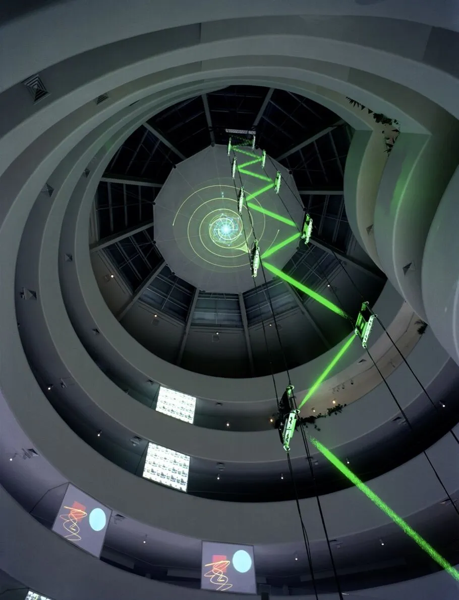 백남준은 구겐하임에서 선보이고 싶은 작품이 있었습니다. 1960년대 중반부터 연구해 온 레이저 기술을 활용한 작품이었죠. 이전까지 레이저는 다른 영상을 쏴주는 역할을 할 뿐이었습니다. 레이저 자체보다, 레이저를 통해 보이는 이미지가 예술로 여겨졌죠. 백남준은 사람들이 레이저 광선 자체를 예술로 감상하길 바랐습니다.