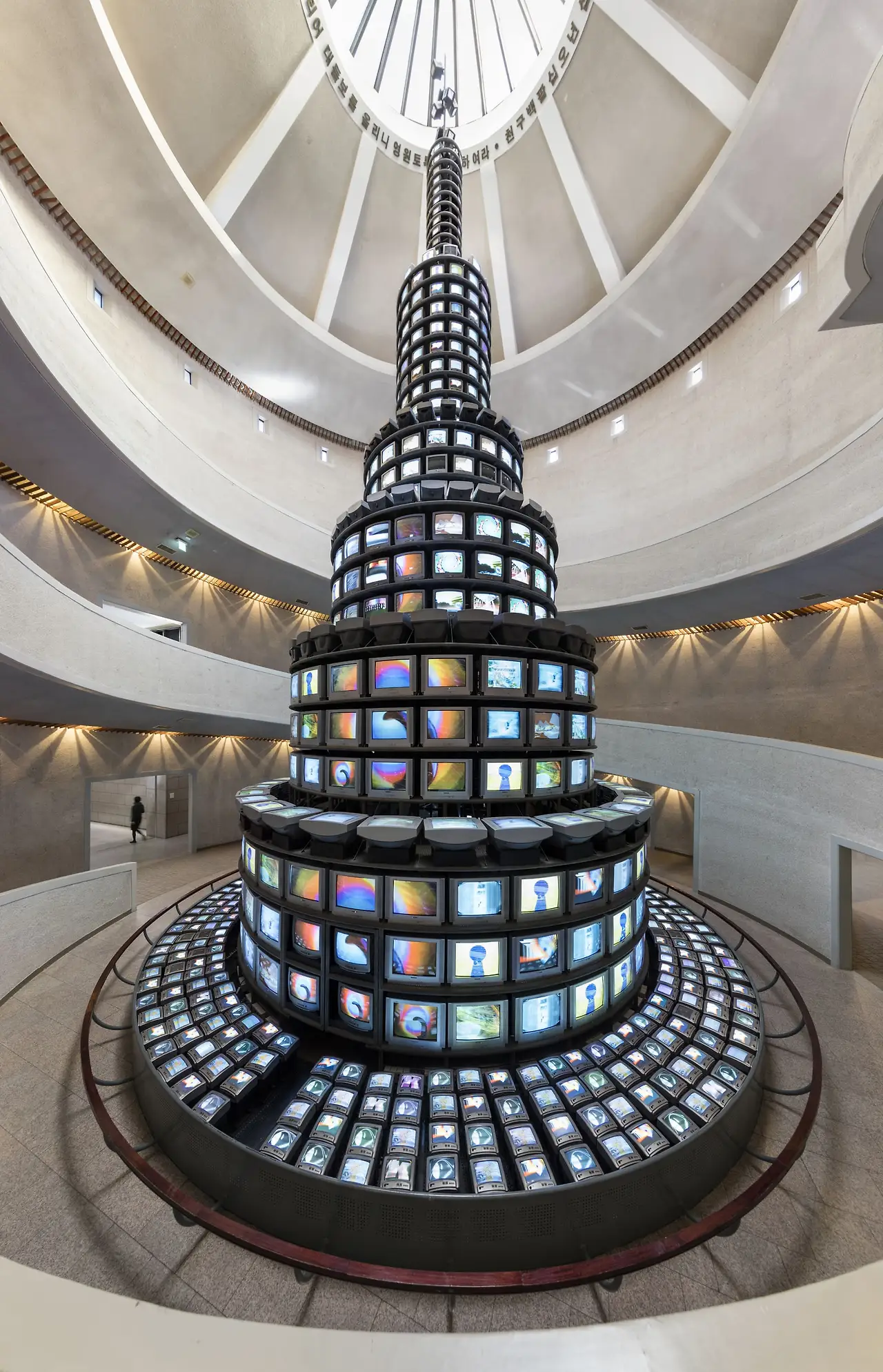 <다다익선>은 '규모의 거대함'이라는 의미를 담고 있습니다. 백남준이 한국에 들어온 1984년, 당시 과천에서는 다가올 88 올림픽을 위해 국립 현대미술관 과천관을 짓고 있었습니다. 2년여의 공사 후 지어진 미술관에는 동그랗고 높은 중앙 홀 (로톤다)이 있습니다. 이를 본 백남준은 여기에 <제3인터내셔널 기념탑> 같은 작품이 있으면 좋을 것 같다고 이야기했습니다. 그리고 , 1천여 개의 TV로 쌓아 올린 탑, <다다익선>을 구상하게 됩니다.