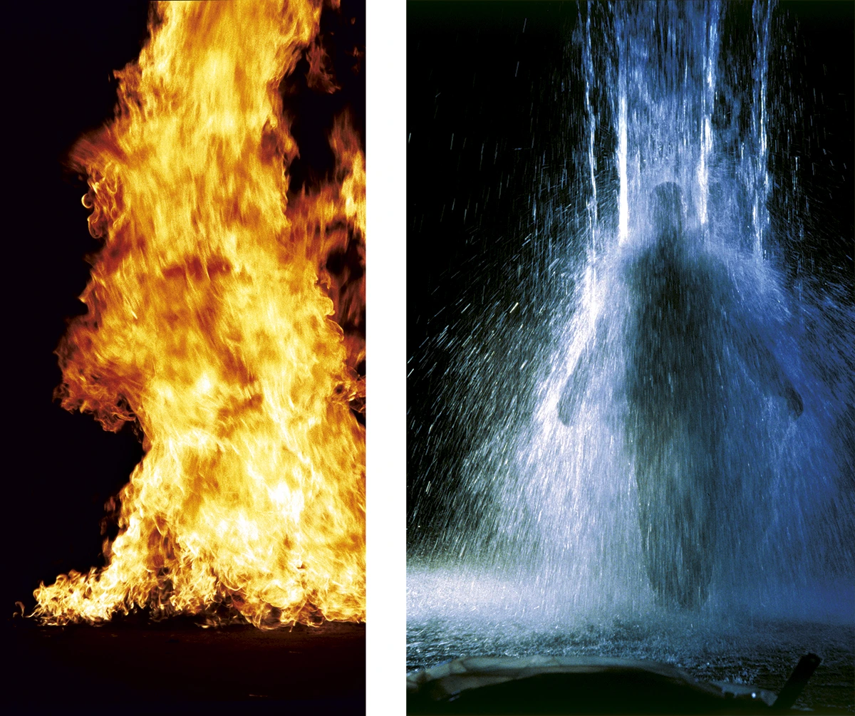 한쪽 스크린에서 남성의 발밑에서 불길이 시작되어 그의 몸 전체를 태우는 장면이 연출되고, 다른 쪽 스크린에서는 남성에게 쏟아지는 빗줄기가 점차 거세어져 결국 그의 몸을 완전히 덮어버리는 장면이 나타납니다. 이러한 불과 물의 이미지는 파괴와 정화, 변화와 재생이라는 상반된 힘을 상징하며, 작품 전체에 깊이를 더합니다. 특히 , 비올라는 고속 촬영 기법을 사용하여 1초당 300 프레임을 기록하고, 이를 느린 화면으로 재생하여 극적인 효과를 강조했습니다. 이러한 슬로 모션 기법은 관람객이 작품의 디테일을 더욱 세밀하게 관찰하고, 변화의 과정을 명상적으로 경험하도록 유도합니다.