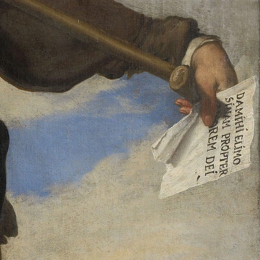 어깨에 걸친 목발, 작은 키, 그리고 라틴어로 쓰인 ' 구걸 허가서'가 보입니다. 당시 나폴리에서 의무적이었던 구걸허가서에는 " 하느님의 사랑으로 저에게 자비를 베풀어 주세요."라고 적혀있습니다. 어느 것 하나 내세울 것 없지만 의기양양한 모습이 그의 현재 처지를 잊게 합니다.