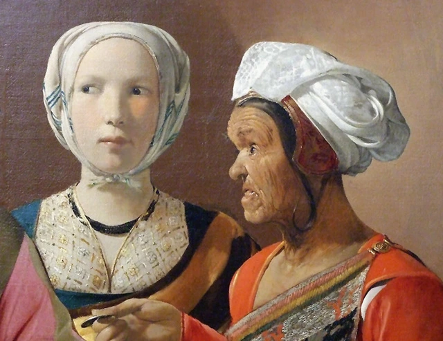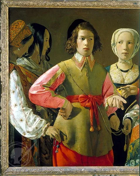 부유해 보이는 남성이 쭈글쭈글 점쟁이 노파에게 동전 한 닢을 건네준 모양입니다. '네가 속을 줄 알고...' 의심스러워하는 남자의 눈빛을 읽었는지 , "한 번 믿어 보세요. 도련님"라고 점쟁이 할멈이 젊은이의 시선을 붙잡고 있는 듯합니다. 그 사이 젊은 여인 두 명이 작업에 들어갑니다. 주머니에 손을 대 값나가는 물건을 슬쩍하려 합니다. 숨도 안 쉬고 눈치를 보며 금붙이를 자르려는 여인의 모습도 보이고요. 탄탄한 관찰력과 인물의 심리묘사로 긴장감을 불어넣습니다. 17세기 카라바지오풍 화가들 사이에서 인기가 많았던 주제입니다.