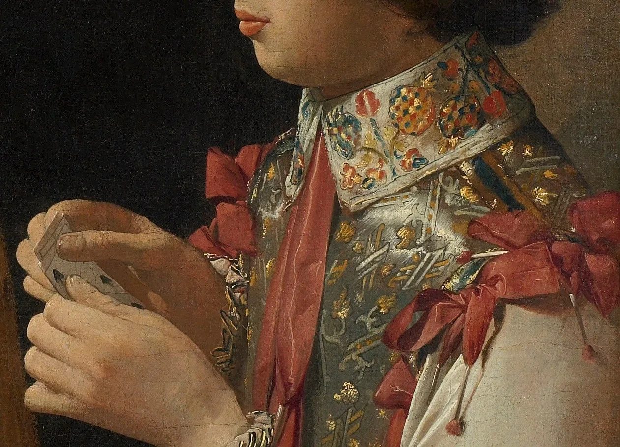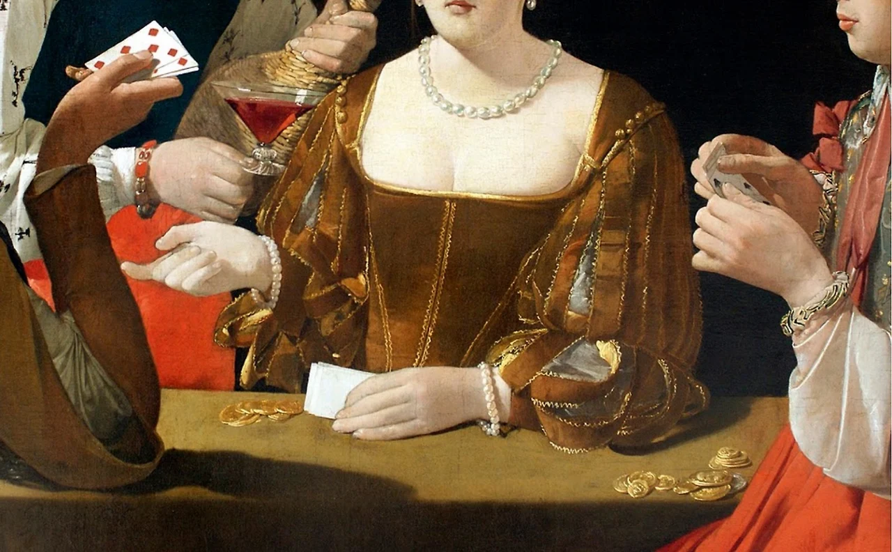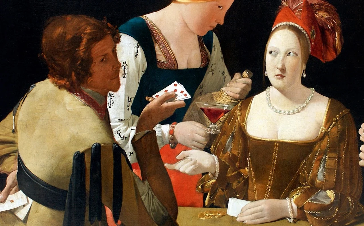 도박, 속임수, 점쟁이 등을 주제로 그린 풍속화 들 중 하나입니다. 화가의 뛰어난 관찰력력 덕분에 팽팽한 긴장감을 느낄 수 있습니다. 하얀 얼굴, 매끈한 피부, 한껏 치장한 모습의 그녀, 모르는 척 술을 따르며 상대의 패를 슬쩍 말해주고 있는 여종, 귀를 쫑긋 세우고 듣고 있는 그녀의 눈 돌아가는 소리, 그리고 벨트에 꽂아뒀던 다이아몬드 에이스를 슬그머니 내보이는 남자. 그들의 신호를 관객인 우리도 아는데... 쯧쯧, 앳된 부잣집 도련님만 모르고 있네요.