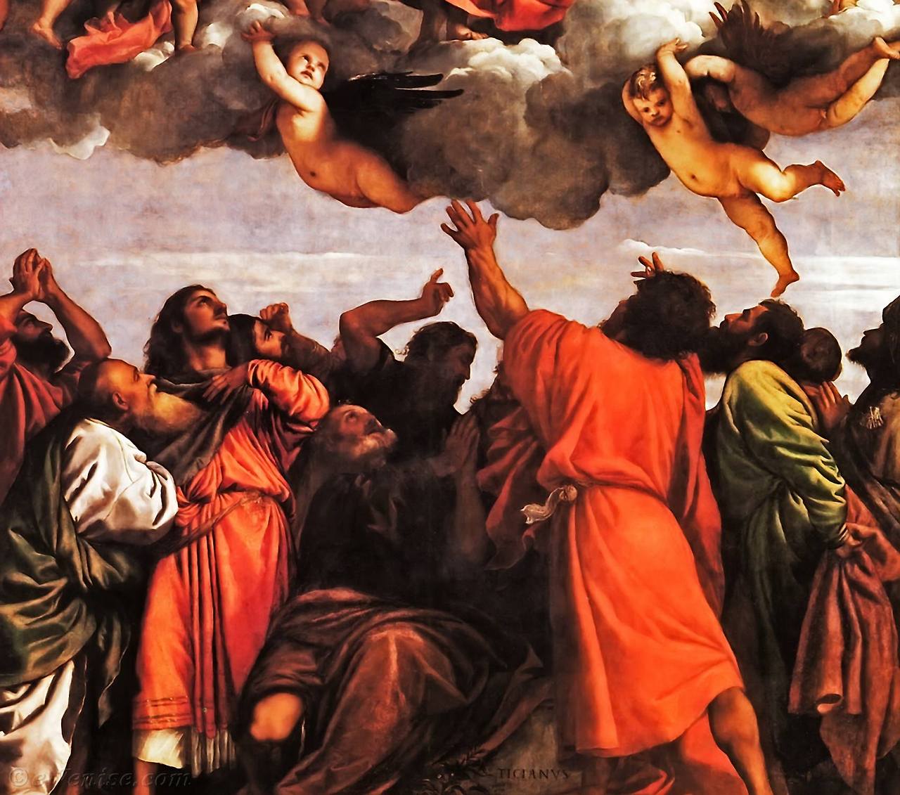 생동감 있는 인물표현, 금빛과 붉은빛의 화려한 색채가 조화를 이뤄 천상으로 향하는 성모마리아의 아름다움을 묘사한 티치아노의 완성도 높은 작품입니다. 30대가 될 무렵 그려진 작품으로 거장 반열에 오르게 한 작품이지요. 이 작품을 계기로 저 멀리 로마까지 그의 이름이 알려지게 됩니다.
