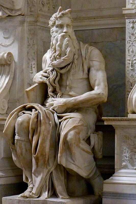 모세상 머리에 있는 뿔은 라틴어 성경인 불가타에서 엑소더스 34장에 나오는 모세의 얼굴 묘사를 잘못 번역한 데서 비롯된 것으로 여겨집니다. 히브리어 단어 "Karan"은 "빛을 발하다" 또는 "뿔이 나다"로 해석될 수 있는데 , 성 제롬이 이를 "뿔"로 번역하면서 모세가 뿔을 가진 모습으로 묘사되게 되었습니다.