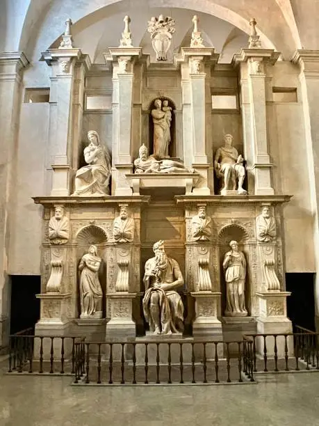 모세상은 8피트가 조금 안 되는 크기로, 앉아 있는 자세로 표현된 되어 있습니다. 근육질의 팔과 분노에 찬 강렬한 눈빛이 특징적입니다. 모세는 팔 아래에 십계명이 새겨진 돌판을 들고 있으며, 이는 그가 시나이 산에서 갓 받은 율법을 상징합니다.