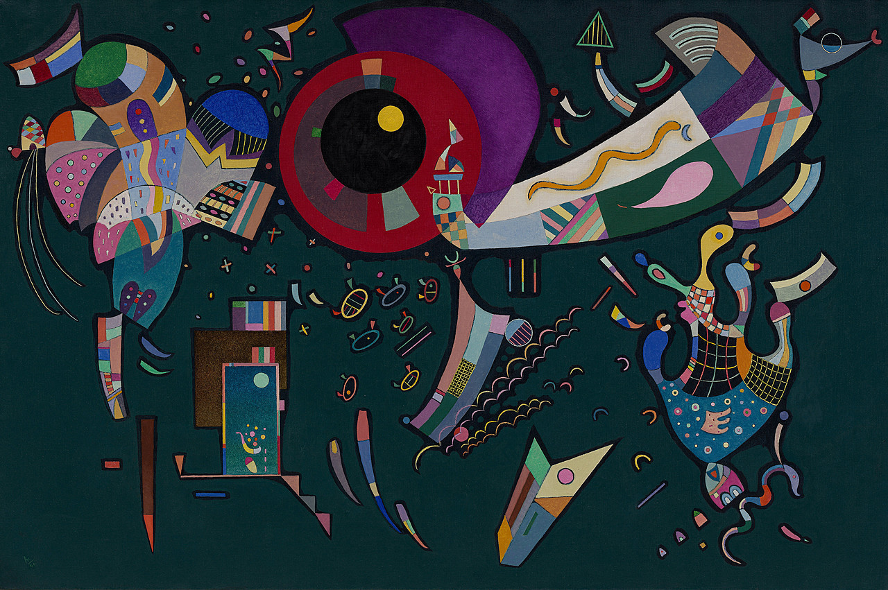 칸딘스키가 바우하우스에서 교수로 활동하던 시기에 완성된 작품입니다. 총 10점으로 이루어진 '구성'시리즈 중 하나이고요. 이 시리즈는 그의 이론서 <점과 선에서 면으로 Point and Line to Plane, 1926>의 사상을 시각적으로 구현한 것으로, 특히 색채와 형태의 관계, 그리고 그들의 심리적, 영적 효과에 대한 연구가 반영되어 있습니다. 칸딘스키는 이 작품에서 날카로운 직선, 둥근 곡선, 크고 작은 원형 등 다양한 기하학적 요소를 조화롭게 배치하여, 마치 음악의 선율처럼 시각적 리듬을 형성했습니다. 마치 그의 추상회화는 오케스트라의 연주처럼 관람자의 영혼을 진동시킵니다.