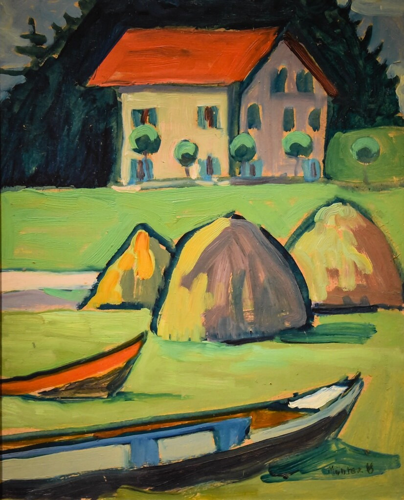 칸딘스키의 추상적 경향과 달리 상대적으로 구상적이며, 뮌터가 표현주의 화가로서 자연과 삶에 대한 따뜻한 애정을 담아낸 모습을 잘 보여줍니다. 청기사파의 특징인 대담한 선과 색채를 사용하면서도, 뮌터 고유의 서정적이고 안정된 화풍을 유지하고 있어 독특한 작품성을 지닙니다.
