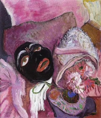 1912년 제작된 가브리엘 뮌터의 < Black Mask with Rose 검은 가면과 장미> 작품입니다. 독일 표현주의와 청기사파 미술 운동과 깊이 연관된 중요한 작품입니다. 이 작품에서 뮌터는 강렬한 색채 사용과 간결한 형태 표현이 두드러지며, 검은 윤곽선을 활용하여 형태를 뚜렷하게 구분하는 기법을 사용하였습니다.