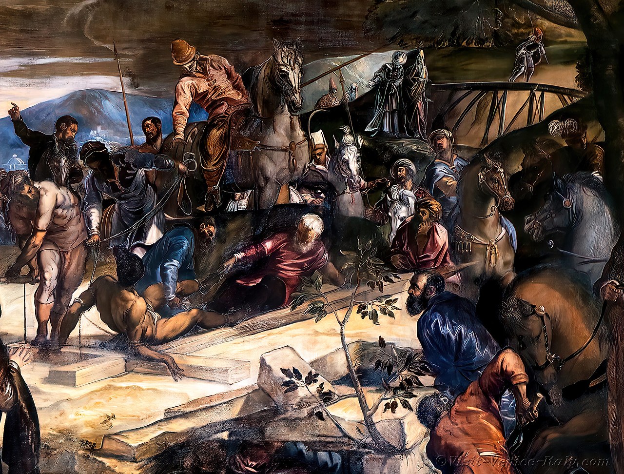 십자가에 못 박힌 예수 그리스도를 중심으로, 골고다 언덕에서 펼쳐지는 다양한 인물들의 드라마틱한 순간을 파노라마처럼 담아내고 있습니다. 전체적으로 약 70여 명에 이르는 등장인물이 배치되어 있고요. 이는 르세상스 후기 베네치아 회화 중에서도 보기 드문 규모입니다. 중앙에는 십자가에 달린 예수님이 초자연적 빛을 머금은 채 어둠과 혼돈의 한가운데 힘 있게 우뚝 서 있습니다. 예수님의 오른쪽 대각선에는 '선한 죄수'가 십자가에 매달리는 장면이 연출되고, 그의 참회의 시선과 예수님과의 교감이 성경의 메시지를 직접적으로 전달합니다.