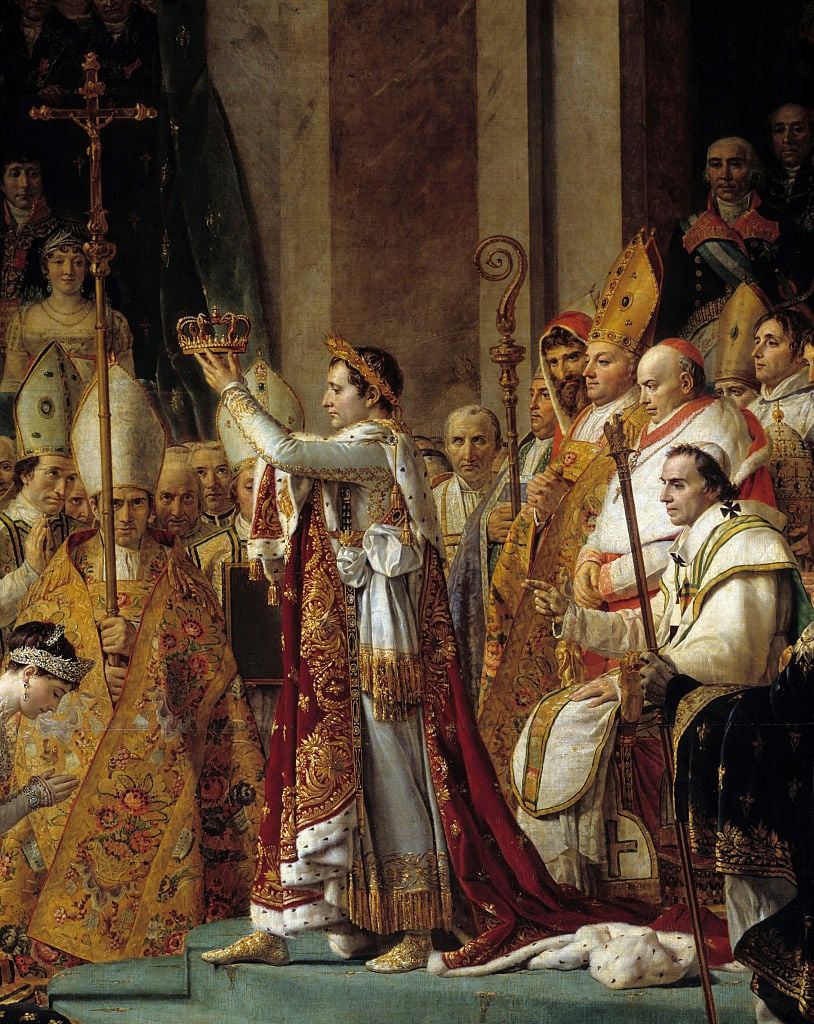 이 대관식은 프랑스혁명 후 혼란기를 종식시키고 나폴레옹이 유럽의 새로운 질서와 권력을 상징적으로 선포한 역사적 사건입니다. 전통적으로 프랑스 왕은 랭스 대성당에서 교회에 의해 왕권을 받았으나, 나폴레옹은 그 관례를 깨고 노트르담 대성당을 배경으로 스스로 황제의 관을 쓴 뒤, 직접 아내 조세핀에게 왕관을 씌우는 파격적인 장면을 연출하였습니다. 이는 세속 권력이 종교 권력(교황)보다 우위에 있다는 강력한 정치적 메시지를 담고 있습니다.