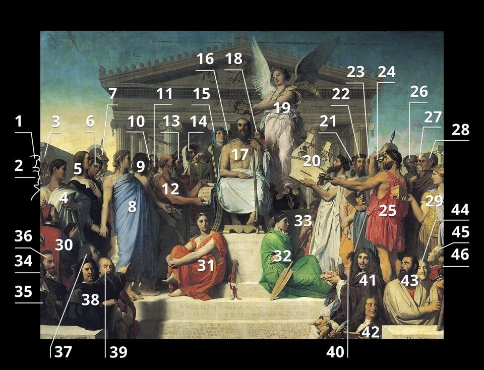 호메로스를 둘러싼 인물들은 시, 철학, 미술, 음악 등 서양 고전문화의 주요 위인들로, 고대와 근세, 그리고 초기 근대 인물이 한데 모여 있는 것이 특징입니다. 예를 들면 오른쪽에는 조각가 피디아스가 망치를 들고 있는 모습으로 등장하고, 그의 옆에는 황금 투구를 쓴 페리클레스, 그리고 황금 갑옷을 입은 알렉산더 대왕이 자리합니다. 왼쪽에는 단테. 미켈란젤로, 라파엘로, 푸생, 볼테르 등 후대의 문학가, 화가, 음악가까지 배열됨으로써 , 이 그림 자체가 서양 문화 계보도의 시각적 표현이 됩니다.