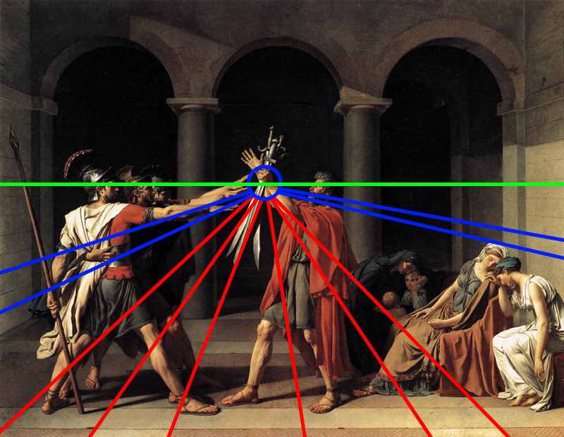 작품 구도에서 '세 명'이라는 숫자가 반복적으로 등장하는 점도 주목할 만합니다. 삼 형제, 세 자루의 칼, 세 개의 아치, 세 명의 여성 등 삼이라는 숫자는 질서와 결의의 상징으로 구조적 안정감과 상징성을 더하고 있습니다. 배경은 단순한 로마식 건축 공간으로 미니멀하게 처리하여 오롯이 인물과 행동에 집중하게 만듭니다.