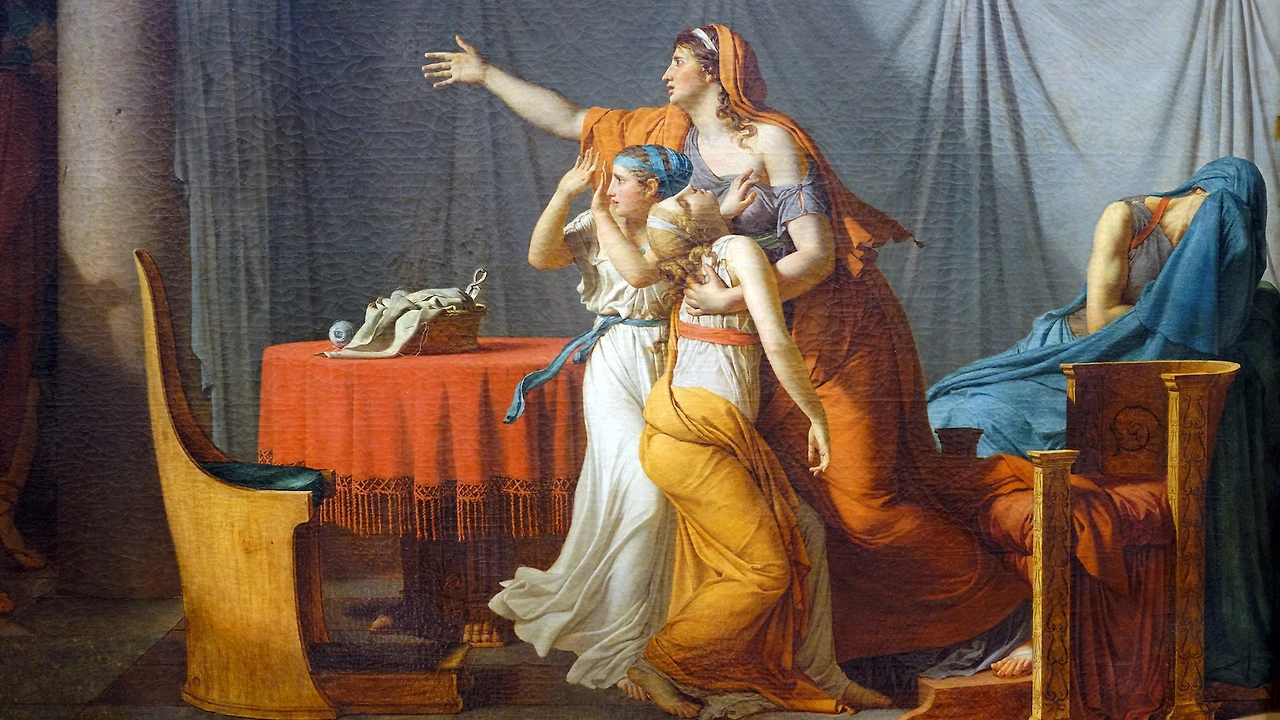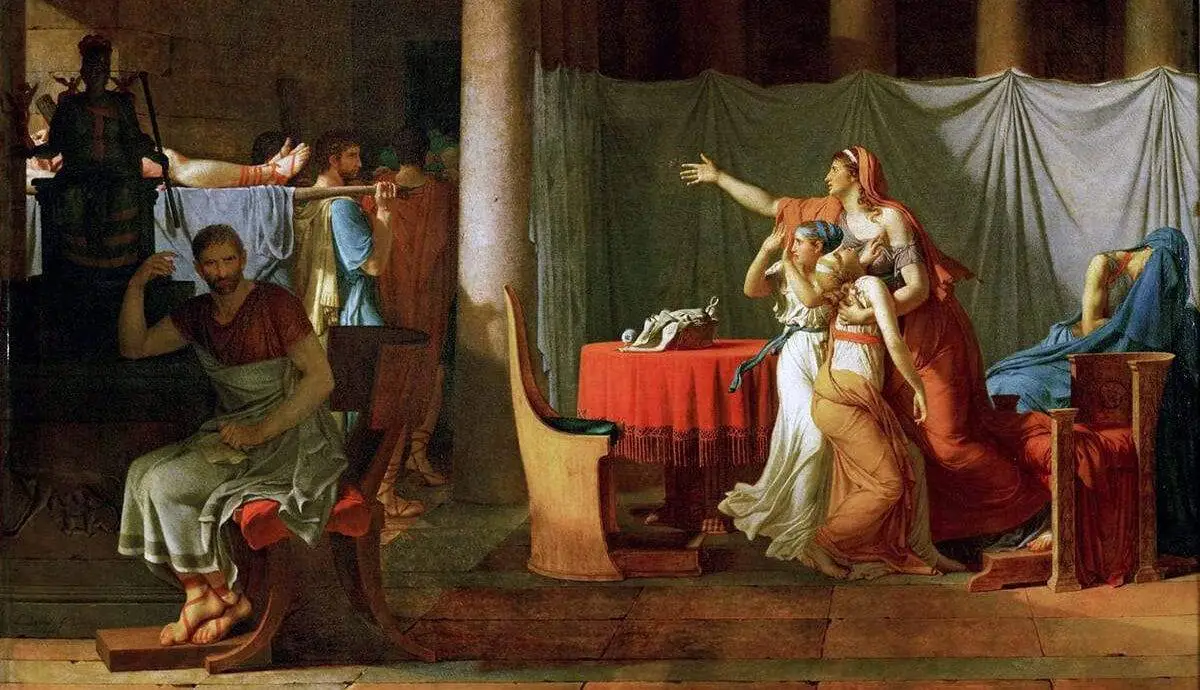 자크 루이 다비드의 < 브루투스에게 그의 아들의 시체를 가져오는 호위병들 The Lictors Bring to Brutus the Bodies of His Sons>(1789) 작품입니다. 고대 로마의 역사 속 한 비극적 순간을 다루고 있습니다. 당시 프랑스 혁명기의 격동과 밀접하게 연관되어 있고요. 주인공인 루키우스 유니우스 브루투스( Lucius Junius Brutus)는 로마 공화정의 창립자로, 자신의 두 아들이 타르퀸 왕정복고 음모에 가담한 것을 밝혀내고, 공화국을 지키기 위해 직접 사형을 선고하는 결단을 내립니다. 이 장면은 국가와 공공의 선을 위해 가족을 희생하는 극한의 도덕적, 시민적 딜레마를 보여줍니다.