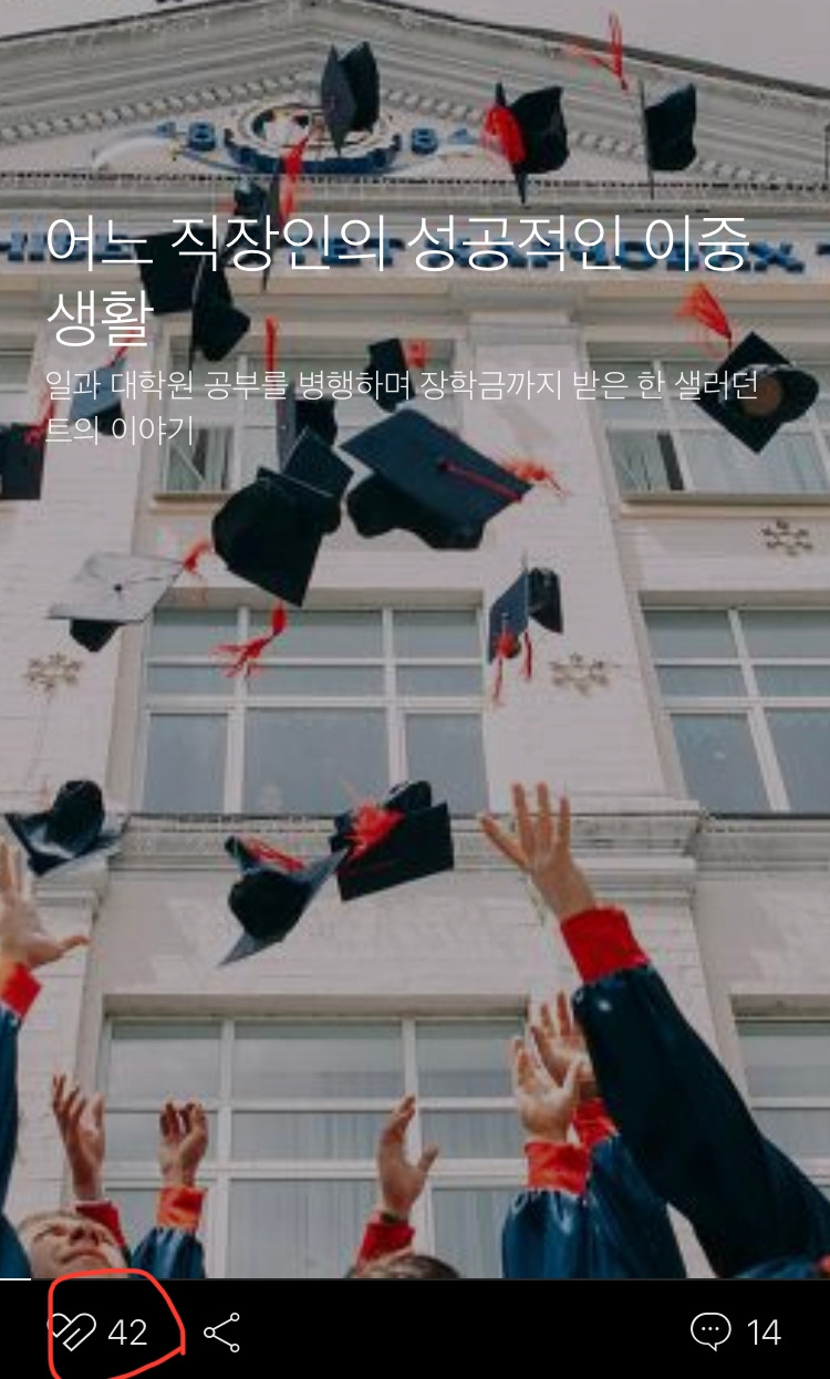 맨 처음 많은 사람들에게 알려진 내 글은 일과 대학원 공부를 병행한 경험을 쓴 ‘어느 직장인의 성공적인 이중생활’(https://brunch.co.kr/@fe560d11240045c/8) 이다. ‘아 요새 글 많이 못 썼는데’하는 생각이 들어 오랫동안 묵혀둔 글을 꺼내놓았는데 그 글이 소위 말해 ‘터진 것’이다!