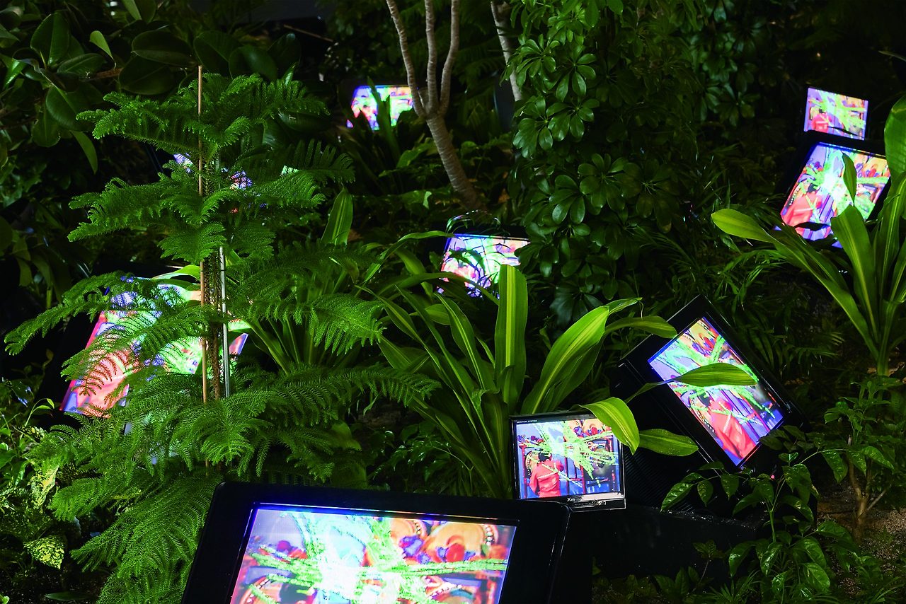 우거진 수풀 속에서 TV들이 꽃송이처럼 피어있는 정원이다. 나뭇잎을 타고 흐르는 텔레비전의 전자적 영상이 다양한 리듬 속에서 생태계의 일부가 됨으로써 백남준은 끊임없이 변화하는 픽셀의 자극과 자연이 내뿜는 초록빛이 함께 어우러지도록 했다.
