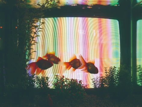 어항 안에서는 살아 있는 물고기들이 유영하고 있으며, 화면에는 춤을 추고 있는 머스 커닝햄, 바닷속을 헤엄치는 물고기, 그리고 하늘을 나는 비행기의 모습이 등장한다. 어항과 텔레비전 화면의 중첩을 통해 실제로 살아있는 물고기와 비디오 속 물고기는 하나의 시공간으로 합쳐진다. 관람자는 어항이 모니터가 되고 모니터가 어항이 되는 시각적 현상 속에서 평소와는 다른 시선으로 텔레비전 화면을 바라보게 되고, 대상을 재단하여 보여주는 프레임으로서의 텔레비전을 인식하게 된다. 이는 기술과 자연의 공존과 상응을 강조하기 위한 것이다.