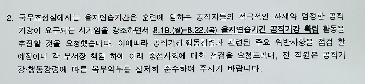 번외로 대학의 계절학기처럼 특별한 시즌도 있다. 바로 명절, 을지훈련, 총선 등 국가적으로 큰일이 있을 때다. 이런 때는 이름만으로도 무시무시한 '공직기강'을 철저히 지켜야 하는 때다. 주로 금품이나 뇌물을 받는 것, 복무위반이나 음주·폭행 등 품위손상, 민원처리 지연, 보안 미비 등을 중점적으로 점검한다. 1년의 한 번씩은 정부부처의 형님 격인 국무조정실에서 불시에 점검을 하러 오기도 한다.