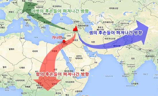 노아의 세 아들 중에서 함이 남쪽으로 퍼져 나갔던 것이다. 하지만 아브라함은 분명 동쪽으로 이동을 시작한 셈의 후손으로 족보상 나와 있다. 셈은 대홍수 사건 2년 후에 아르박삿(Arphaxad)을 낳았는데, 그의 계보에서 믿음의 조상 아브라함이 태어나는 것이다.