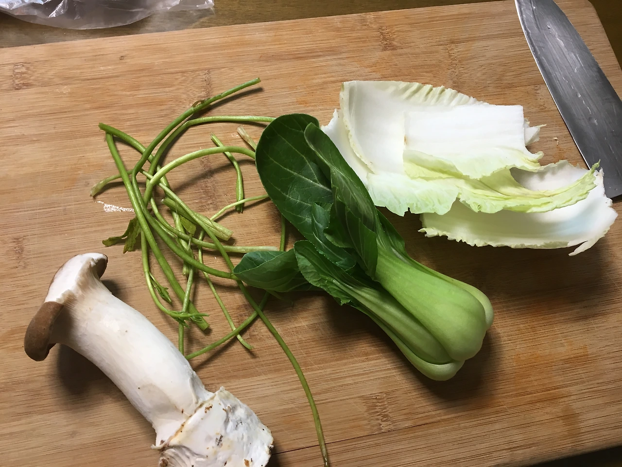냉장고에 잘 숨어있던 버섯, 미나리, 청경채, 배추입니다
