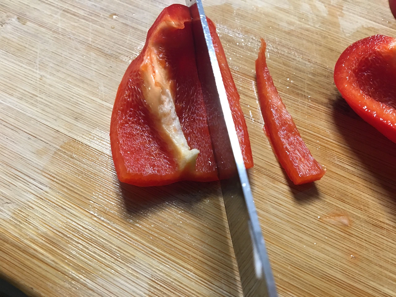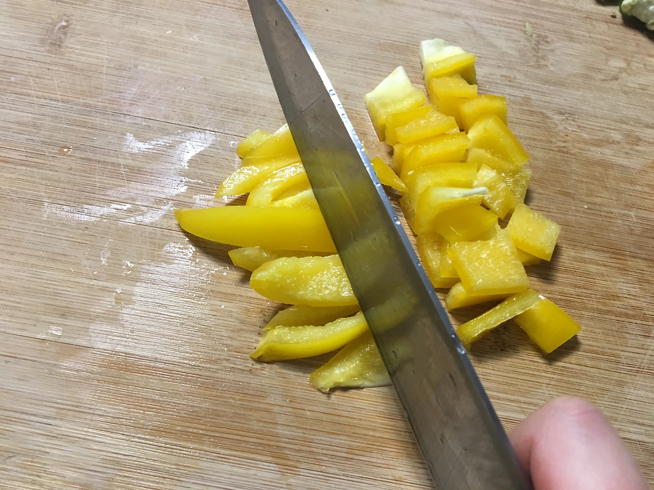 양파, 파프리카를 먹기 좋은 크기로 자릅니다