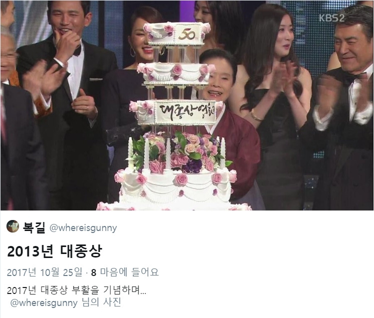 저자 복길(@whereisgunny)은 여전히 본인이 시청 중인 프로그램을 캡처하고 코멘트를 더해 트위터로 중계를 합니다. 트위터 특성상 흘러간 타래를 온전히 다시 보기는 어려우나, 2015년에 ‘제50회 대종상 영화제(2013)’를 다시 보며 중계한 타래가 모멘트로 남아 있어 url을 공유합니다. 웃음을 터뜨리기 쉬우니 혼자 있을 때 보는 것을 권장합니다.