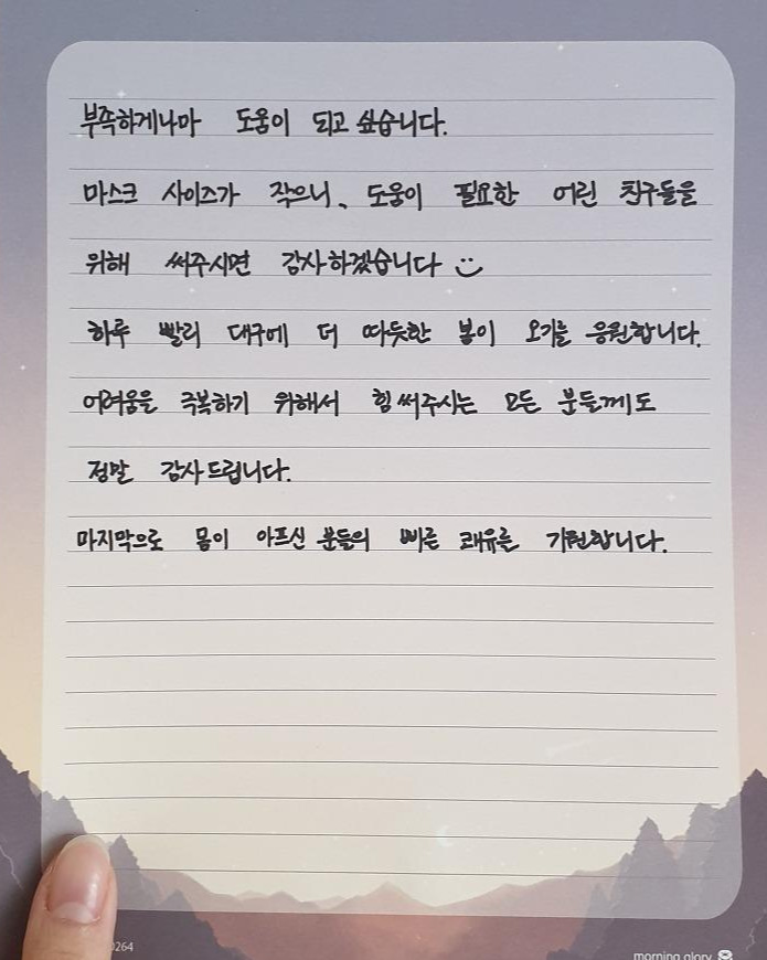 구청에 가서 멋쩍은 웃음으로 마스크를 건넸다. 뭔가를 기부한다는 것이 낯설기도 했고 조금 설레기도 했다. 작지만 도움이 되고 싶다고.. 간단한 인사를 건네고 가려는데 구청 담당자께서 이름과 전화번호를 알려달라고 하셨다. '별거 아닙니다'라는 나의 말에 '그래도 알려주시면 좋겠습니다'라고 하셔서 준비해 간 편지봉투에 이름을 적어서 드렸다.