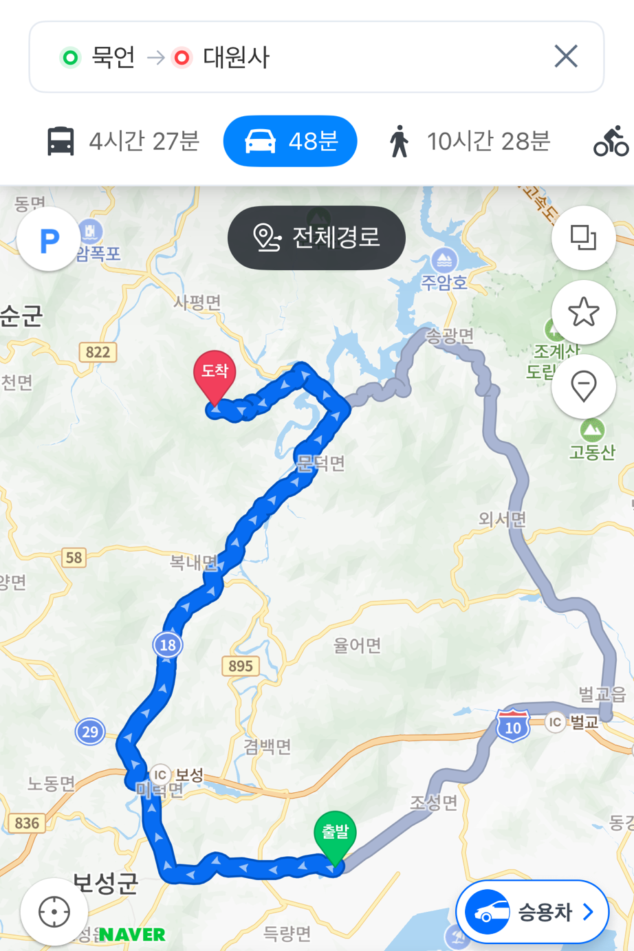 가장 가까워 보이는 곳은 바로 대원사. 이왕 이렇게 된 거, 템플스테이까지 예약했다. 주변에 적당한 숙소가 없으면, 사찰에서 자기 — 나만의 여행 방식이다. 문제는 교통편이었다. 지방 버스는 배차 시간이 길기 때문에, 정확한 시간에 대기하는 게 중요했다. 네이버에서 열심히 정보를 검색했다. 그렇게 찾아낸 첫 차는 오전 9시 20분. 숙소에서 8시 즈음에 나가야 하는구나. 우선 자야겠다.