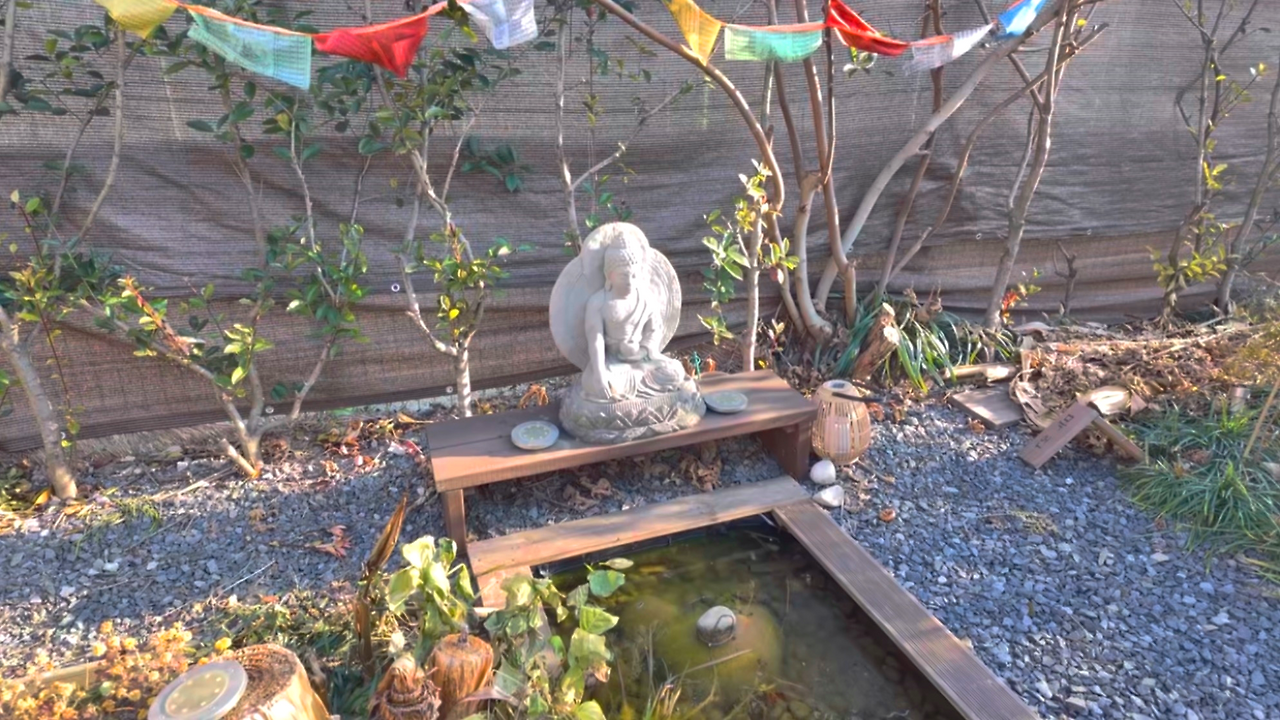 우선 문 앞에는 내 팔 길이 만한 불상이 있었다. 위에는 차크라 색상을 담은 가랜드가, 아래는 작은 물줄기가 흘렀다. 발리에서 볼법한 풍경이었다.
