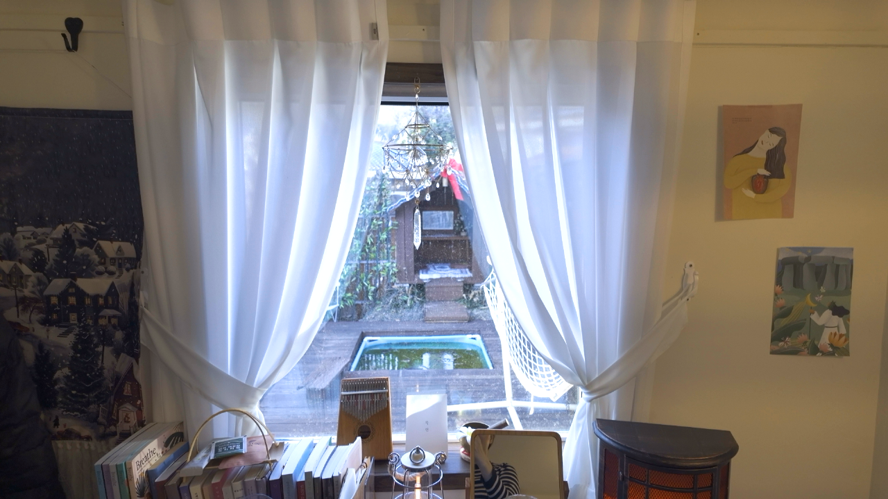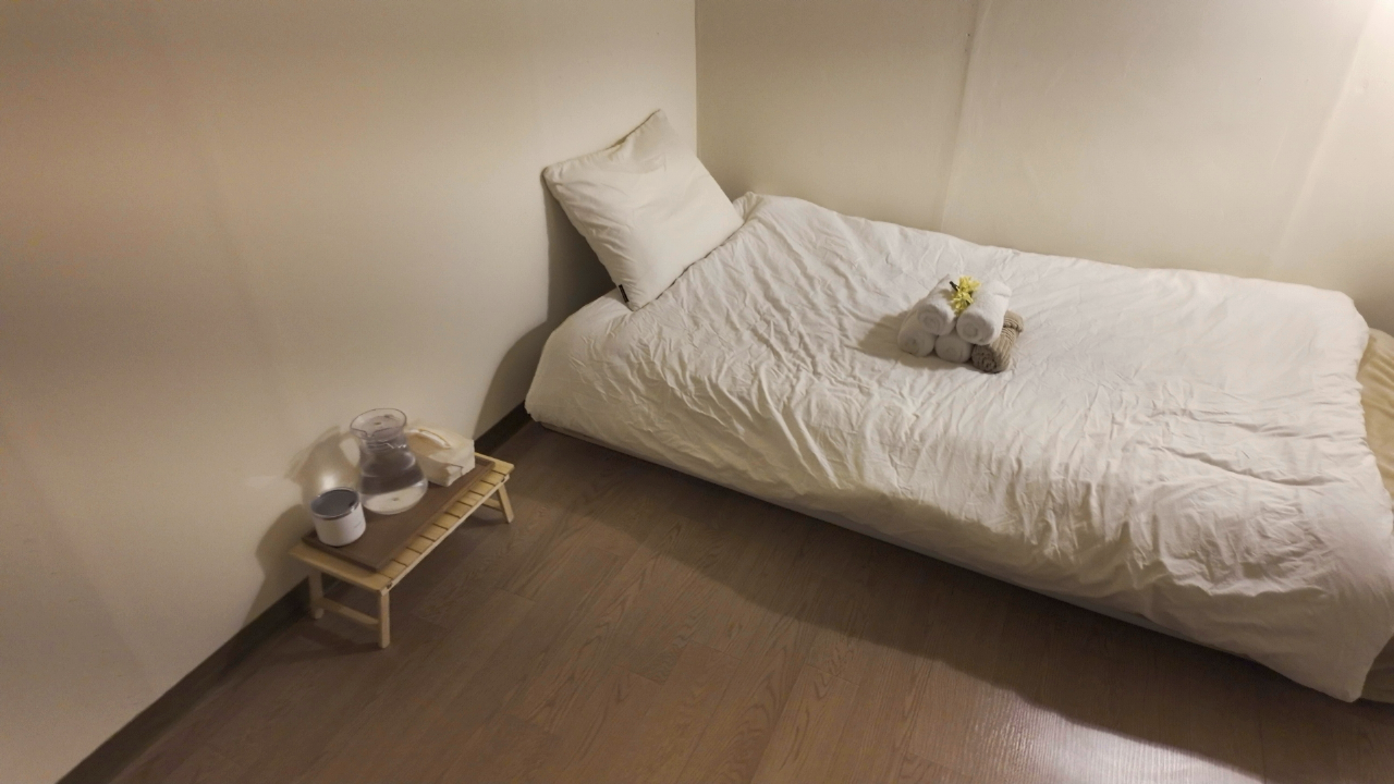 안에는 침대와 책상뿐이었다. 단순했지만, 포근했다. 책상에는 책 몇 권, 방명록 노트, 손바닥 만한 싱잉볼이 있었다.