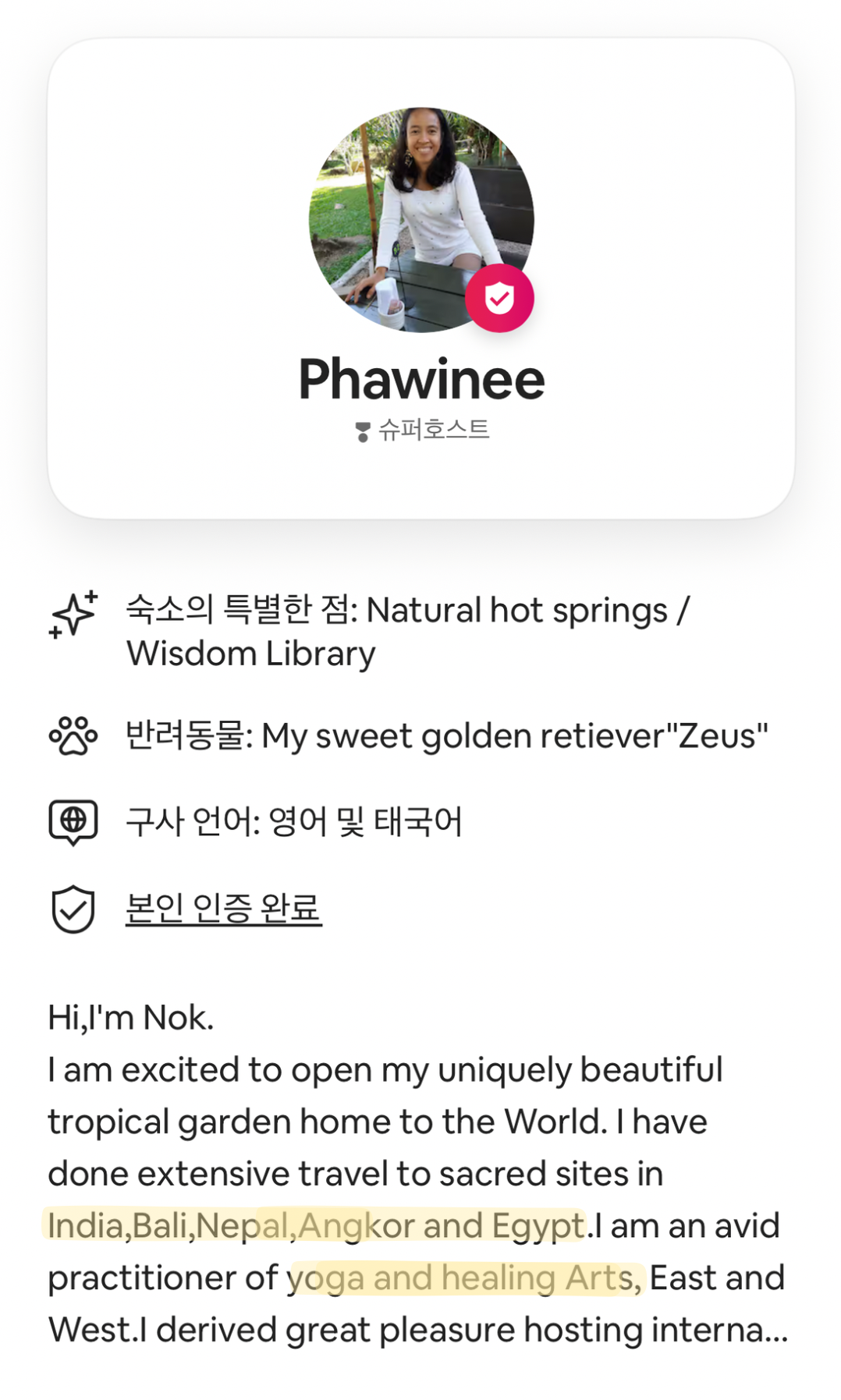 이왕이면 호스트와 가까이 지낼 수 있는 에어비앤비에 예약하고 싶다. 다행히 인도네시아, 네팔, 이집트 등지에서 수련한 힐러가 운영하는 MYSTERY SPRINGS 숙소를 찾았다. 빠이에 힐러, 이름까지 — 그야말로 환상의 조합이었다.