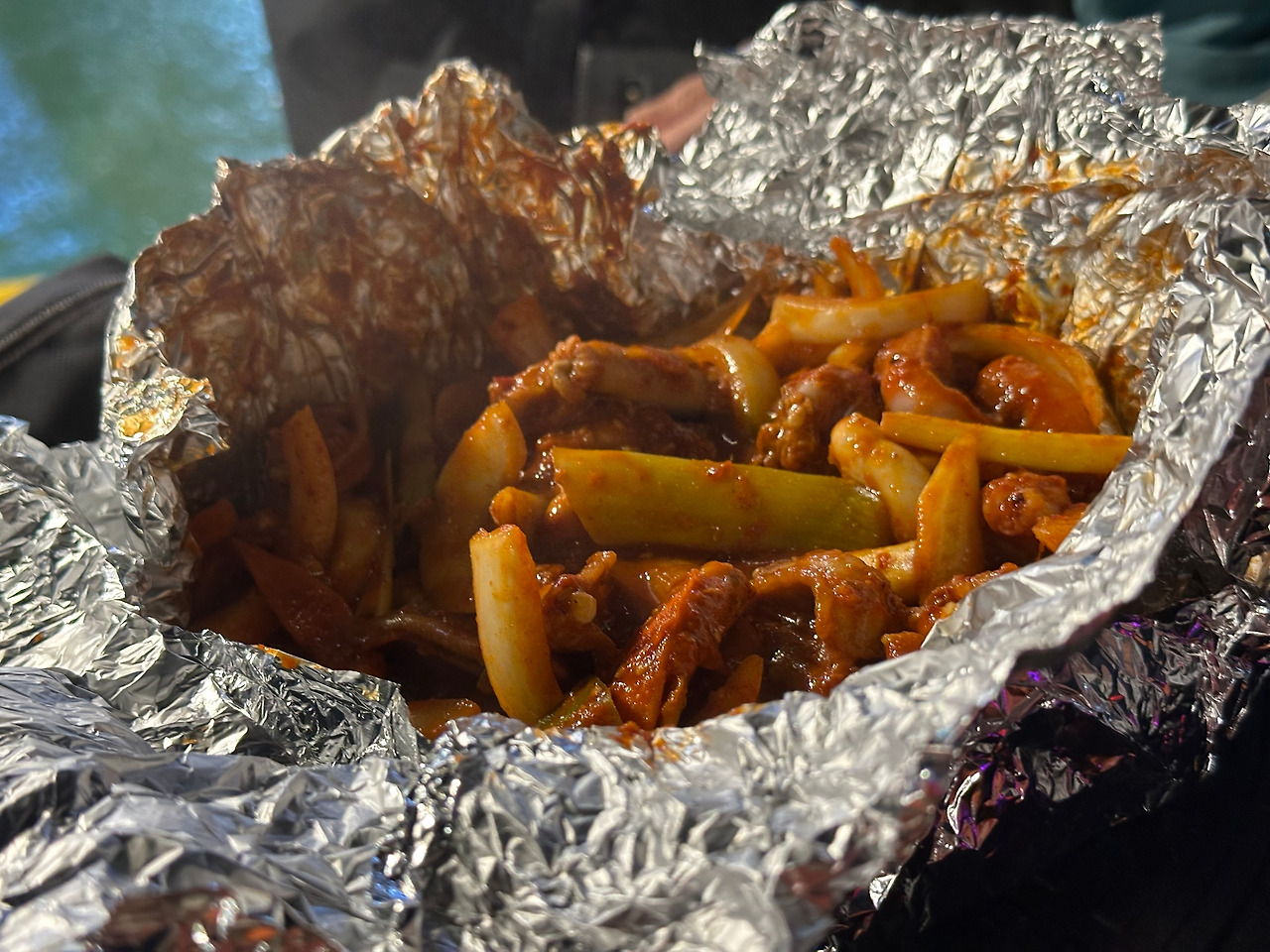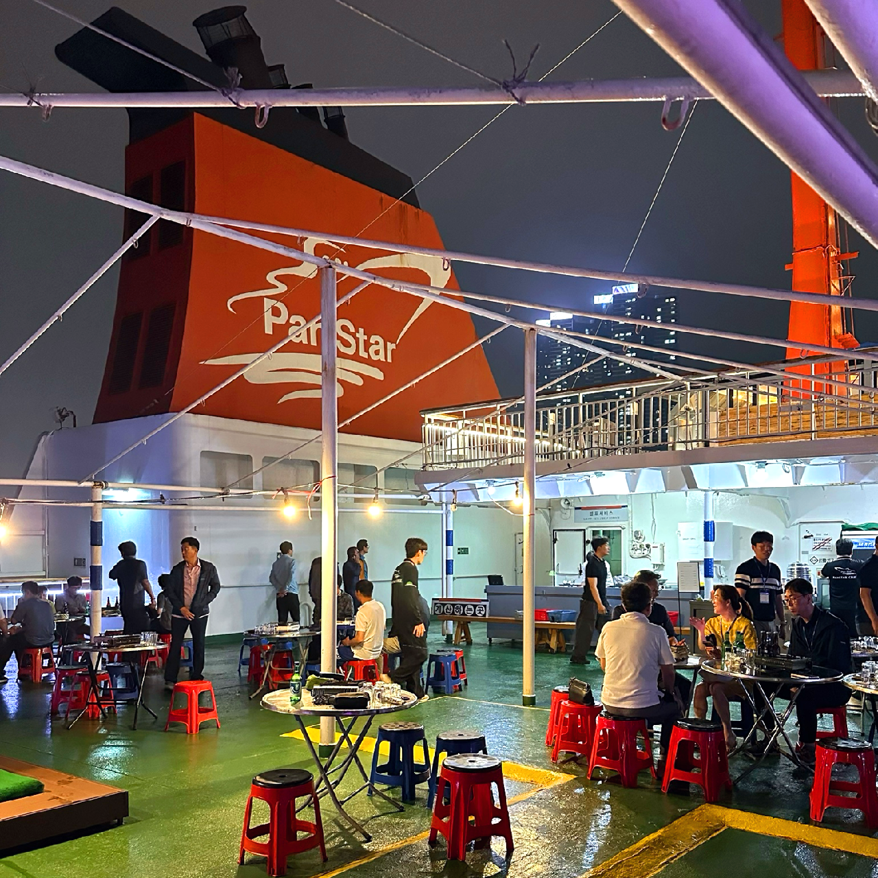 포차가 열린다는 안내 방송이 나왔다. 배 안이 심심하면 어쩌나 걱정했는데, 잠시도 쉴 틈이 없었다. 우리는 곧장 달려갔다. 낮에는 텅 비어 있던 공간에 식탁이 줄지어 놓이고, 승무원들은 분주히 요리하고 있었다. 손님들은 주문하느라 바빴다. 메뉴는 곰장어, 통닭, 떡볶이. “곰장어 3인분 남았어요!” — 판매 상황을 알려준 덕분에 때맞춰 주문할 수 있었다. 저녁을 잔뜩 먹었는데, 잘만 들어갔다.