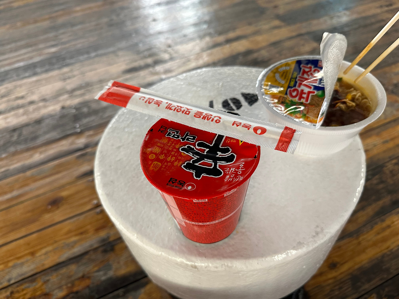 갑자기 시원한 라면 국물이 떠올랐다. 배 안 편의점에 가봤다. 멀미하는 사람을 위한 위생 봉투, 밤새 놀고 싶은 사람을 위한 게임류, 사발면과 각종 햇반류. 마른 반찬에 김까지 판매하고 있으니, 안 살 수 없었다. 동생과 나는 신라면을 하나씩 끓였다. 안개 낀 선상에서 국물을 호호 불어가며 먹었다. 맛은 평소와 같았지만, 그날의 공기와 바다 냄새 덕분에 잊을 수 없는 한 끼가 되었다.
